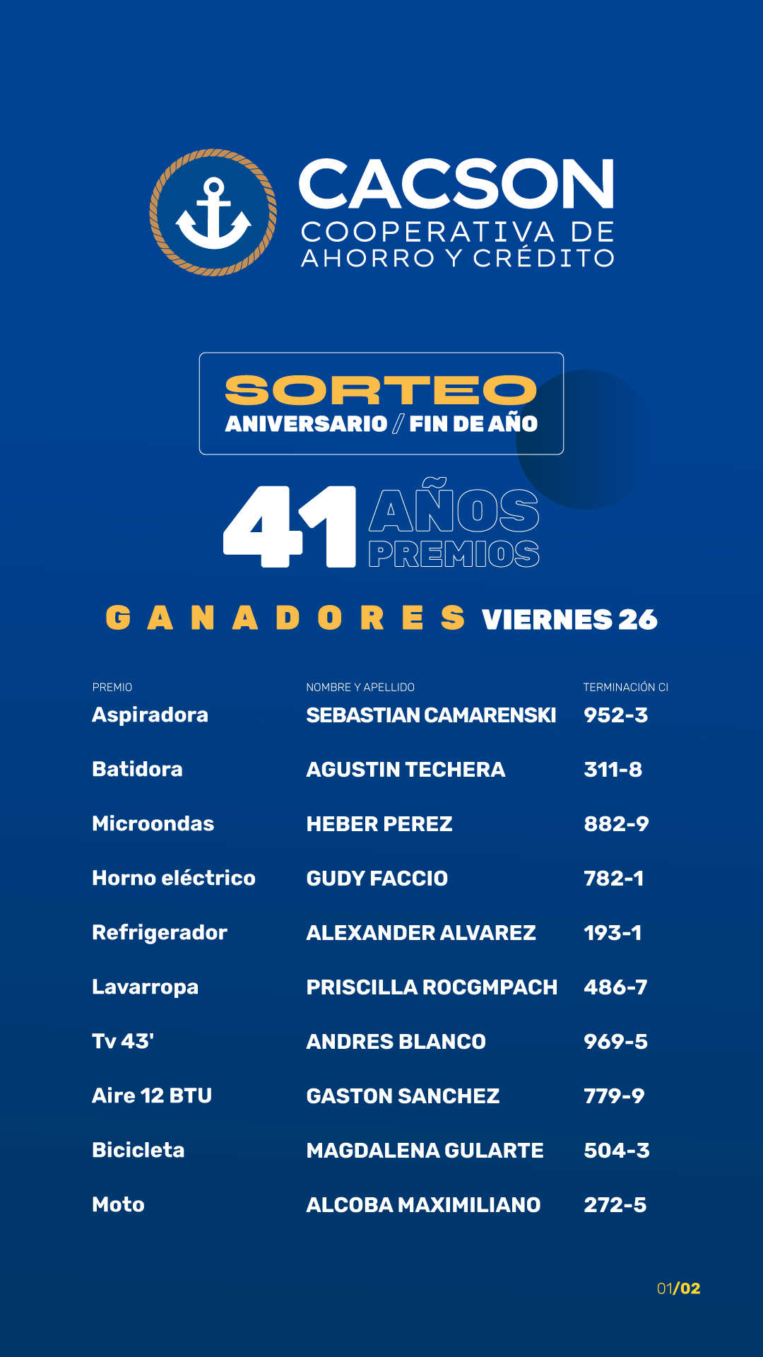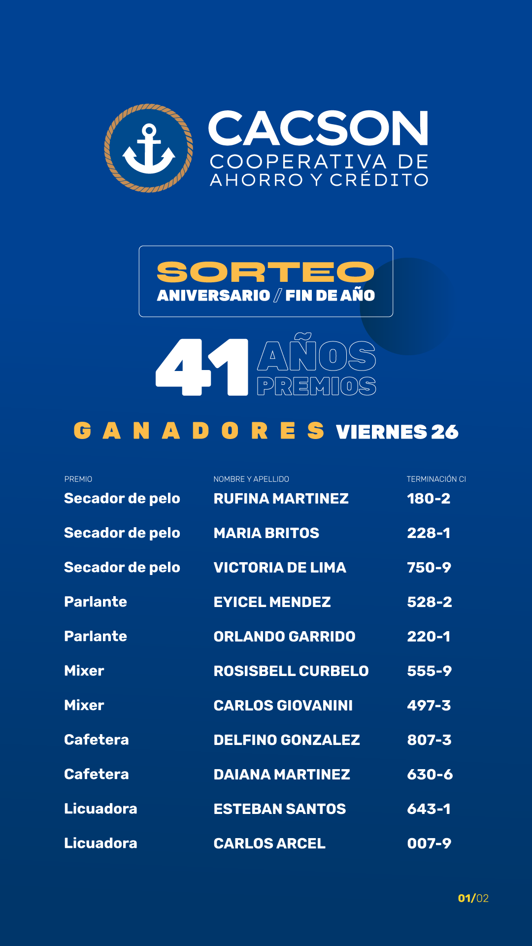 By admin 29 de diciembre de 2025 No hay comentarios Ganadores del segundo sorteo ¡Ganadores del segundo sorteo de Aniversario y de Fin de Año! Viernes 26/12 Noticia anterior ¡Felices Fiestas!